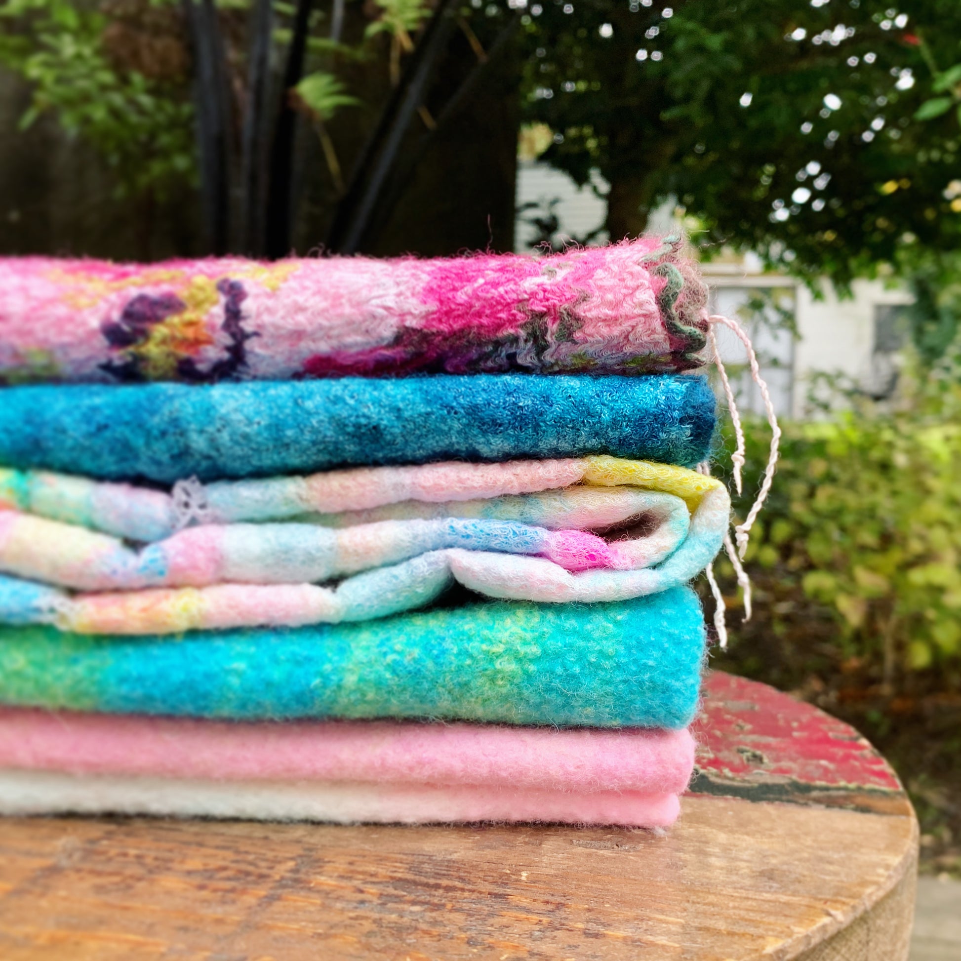 One layer fine combed Merino + one layer of silk gauze fabric: The felted material shrinks approximately 20–24 cm in one direction. To achieve more shrinkage in the width, I recommend laying your fibre out in a horizontal (landscape) direction.